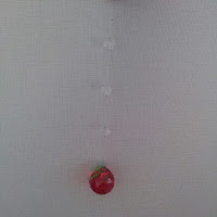 コロンとした赤いりんごと、その上に透明なビーズが連なっています。